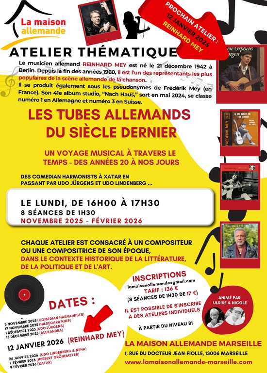 | Le musicien allemand Reinhard Friedrich Michael Mey est né le 21 décembre 1942 à Berlin. Depuis la fin des années 1960, il est l'un des plus populaires de la scène allemande de la chanson. Il se produit également sous les pseudonymes de Frédérik Mey (en France), Alfons Yondraschek et Rainer May. Dès son enfance, il apprend à jouer du piano, de la guitare et de la trompette, et acquiert très tôt de l'expérience sur scène et dans divers groupes. La première chanson de Reinhard Mey, "Ich wollte wie Orpheus singen" paraît en 1964. Dans les années qui suivent, il fait une tournée en Allemagne avec Hannes Wader et joue avec lui des morceaux allemands et français dans les clubs et sur des scènes de théâtre. Reinhard Mey acquiert une première popularité en participant occasionnellement à des émissions de radio et de télévision. En 1971, il perce dans l'espace germanophone grâce au double LP Reinhard Mey live et à la chanson "Der Mörder ist immer der Gärtner " qui y figure. Entre 1967 et 2020, Reinhard Mey publie près de 40 albums studio. Sur son album Lieder von Freunden (2015), il publie des chansons d'artistes connus comme Rio Reiser, Klaus Hoffmann, Ludwig Hirsch et Boris Vian. Au cours de sa longue carrière, Reinhard Mey remporte également de grands succès en France et aux Pays-Bas. Au total, sept albums de Frédérik Mey et deux LPs live, également en français, paraissent dans ces deux pays. Reinhard Mey connaît son plus grand succès en 1974 avec le titre "Über den Wolken". Il atteint à quatre reprises la première place du hit parade allemand des albums: Mein achtel Lorbeerblatt (1972), Bunter Hung (2007), Dann Mach's Gut (2013), également première place en Autriche et Nach Haus (2024). L'auteur compositeur-interprète remporte plusieurs disques d'or, le premier lui étant décerné pour Ich bin aus jenem Holze (1971). Son 41ème album studio, Nach Haus, sort en mai 2024, se classe numéro 1 en Allemagne et numéro 3 en Suisse. SÉANCES le lundi de 16h00 à 17h30 8 séances de 1h30 chacune novembre 2025 - février 2026